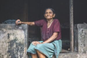 Fotografiada por Meenakshi Soman en 2018, Devaki, en ese entonces de 76 años, ha cuidado a su hijo paralítico, que está postrado en cama, durante casi 30 años. “Tengo tres hijas”, dice. “De vez en cuando lo visitan y ayudan a bañarlo”.