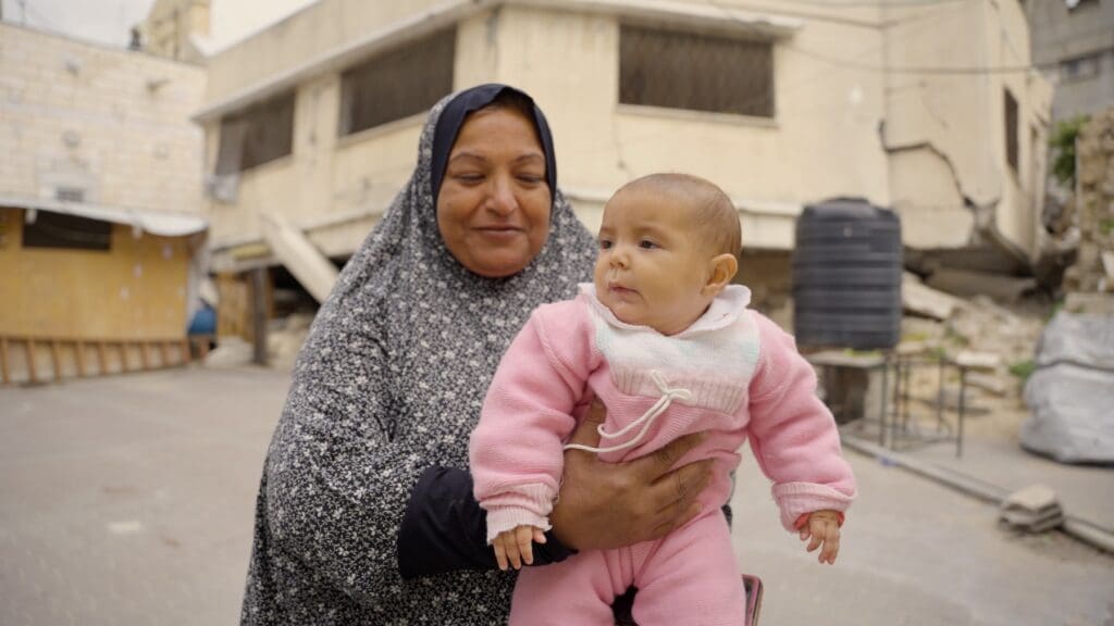 Um Mohammed Al-Azazmeh, a displaced Muslim sheltering within the compound of St. Porphyrios Greek Orthodox Church with her married children and grandchildren, holds her granddaughter who was born during the war inside church compound. (Photo: Diaa Ostaz)